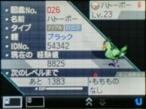 ・ゲットした色違いハトーボーはタイプがノーマル・ひこう、特性きょううん、Lv.23、しんちょう、♀だった。覚えているはねやすめやみきりが面倒臭かったなあ。