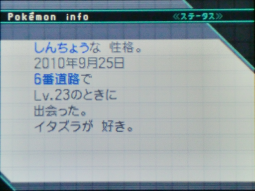・ポケセンで回復して、いざ6番道路へ、と思ったらベルに呼び止められる。しまった、居るのを忘れていた。そういえば最近出て来ないなあとは思っていたけど。またこのパターンか。